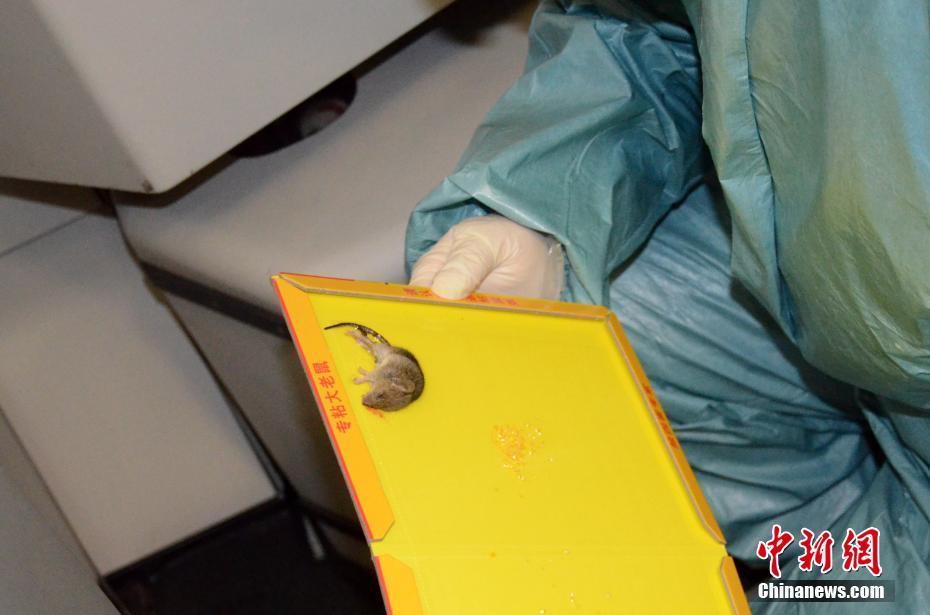 4月9日,四川出入境检验检疫局对媒体通报:日前,该局接到报告称,由美国洛杉矶飞往国内中转至成都双流国际机场的航班客舱内发现活鼠,检疫人员随后开舱检查,发现客舱头等舱右侧舱门角落处一块粘鼠板上粘住一只小鼠,身长约6-7厘米,已经死亡。 钟欣 摄