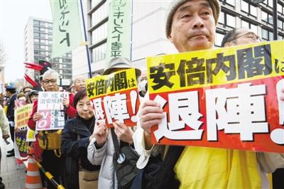 日本民众日前在位于东京的国会大楼外手举标牌集会示威,谴责安倍政府政策,并要求安倍辞职。