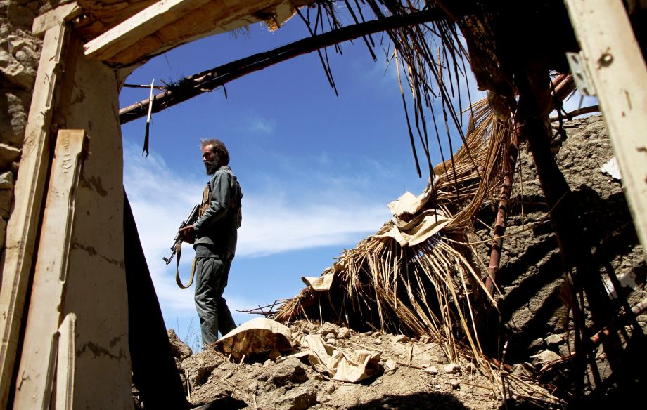 4月15日,在阿富汗楠格哈尔省阿钦地区,一名阿富汗警察在爆炸现场附近巡逻。阿富汗东部楠格哈尔省政府15日发表声明说,驻阿美军投放的大型空爆炸弹在该省炸死的极端组织“伊斯兰国”武装分子已达94人。新华社发(拉赫曼·萨菲摄)