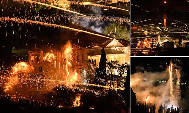 【环球网综合报道】提到复活节,人们通常想到的是复活节彩蛋、复活节兔子和鲜花。但接下来的这两个教堂却用另一种独特的方式来庆祝这一盛大的节日。据英国《每日邮报》4月16日报道,近日,希腊希俄斯州小岛上两所敌对教堂的信徒们通过互相发射自制火箭来庆祝复活节,场面甚是壮观。