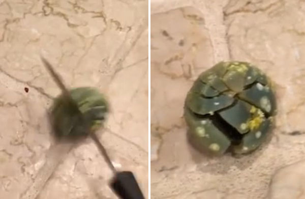 这枚色彩缤纷的鸡蛋在9年前复活节的“寻找彩蛋”游戏中被遗忘在沙发坐垫下,直至今天才被发现。在这段令人反胃的视频中,在Reddit McReddit摇了摇鸡蛋后,能听到有东西在里面翻滚,他说道“里面已经变成一个皮球了。”继而用刀敲开9岁的鸡蛋壳,露出里面一个奇形怪状、腐烂的肿块。