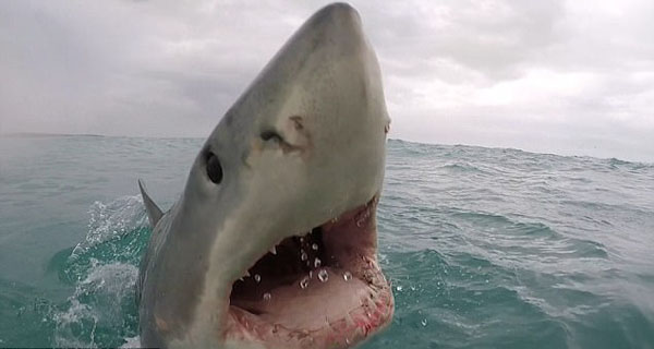 【环球网综合报道】据英国《每日邮报》4月17日报道,日前,海洋摄影师安东尼·科博威斯基(Anthony Kobrowisky)在南非西开普敦省附近的海面上拍摄到了一段惊人的视频:一条张着血盆大口的大白鲨跳出水面,想要吃摄影师抛出的食物,它锋利的牙齿和大张的嘴被镜头清晰地拍下。拍摄的距离之近,以至于连它的咽喉和表皮的毛孔感觉都能看得清。