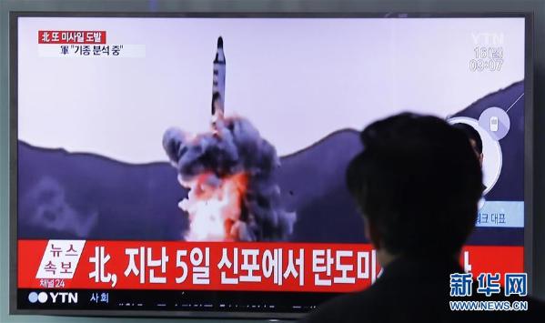4月16日,在韩国首尔,一名男子在火车站观看朝鲜试射导弹的新闻