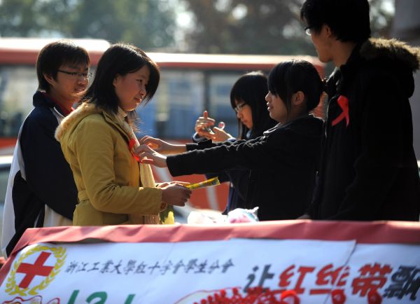 资料图:2008年12月1日世界艾滋病日,浙江工业大学的志愿者们为同学带上“红丝带”。新华社记者徐昱摄