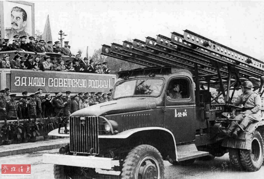 根据苏军公开资料,二战期间共研制了至少18种多管火箭炮(包括牵引式和自行式),其中产量最大的一种自行火箭炮就是图中的BM-13-16。其采用滑轨定向发射器,共有8条发射滑轨,一次齐射可发射16枚132毫米火箭弹。图为参加阅兵式的BM-13-16“喀秋莎”火箭炮。
