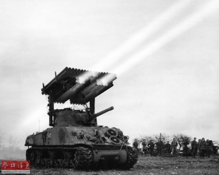 苏军并非是盟军阵营唯一使用多管火箭炮的部队,美军在二战中也投入了多种牵引、自行多管火箭炮。其中典型的代表是于1943年在M4谢尔曼坦克上改进的T34自行火箭炮,其使用的是60联装114毫米多管发射装置。