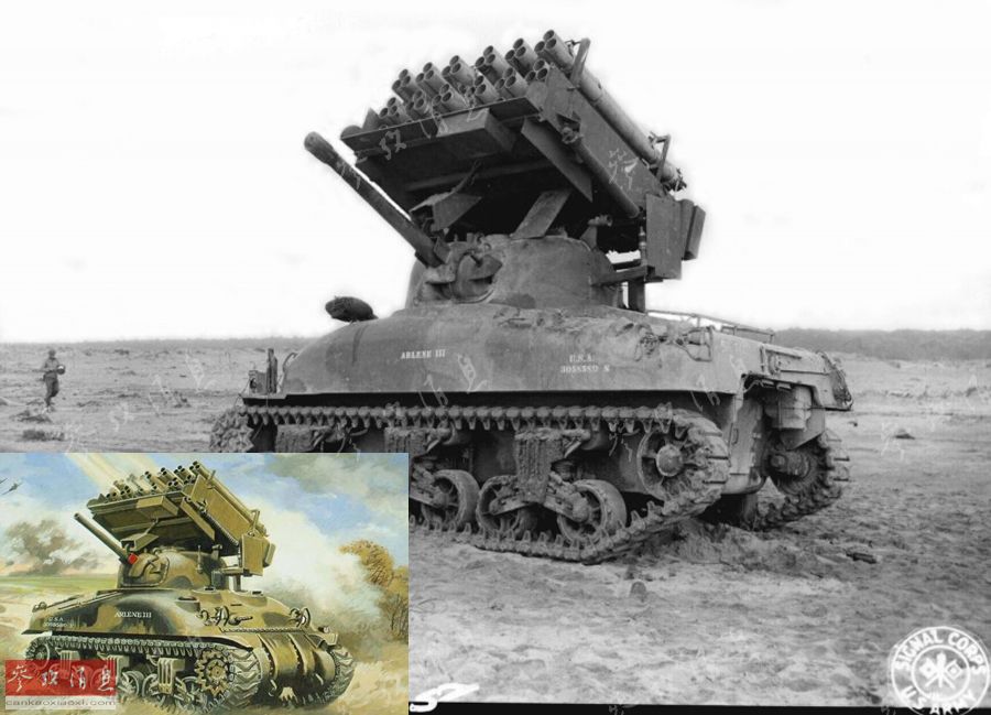 图为基于T34的另一种改进型,M17自行火箭炮,改用183毫米火箭炮,威力虽增大不少,但射程降至2000米,小图为彩图。