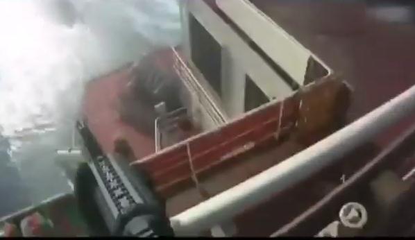 在视频一开始,保镖手持突击步枪,向接近货轮的海盗小船射击多发子弹,一些弹头射到海上,让平静的海面溅起许多小水花。