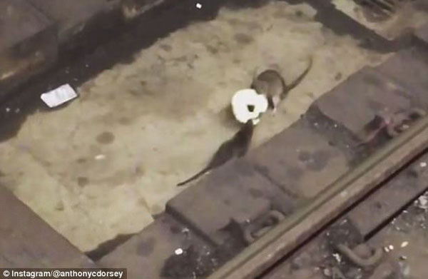 【环球网综合报道】美国纽约市地铁线向来是充满故事的地方。那里不仅有人与人的奇遇,有时候小动物也成为了故事的主角。据英国《每日邮报》4月23日报道,美国小伙安东尼·多西(Anthony Dorsey)近日在图片分享网站Instagram上分享了一段视频,镜头里记录的竟然是两只老鼠在地铁铁轨上争抢面包圈的场面。