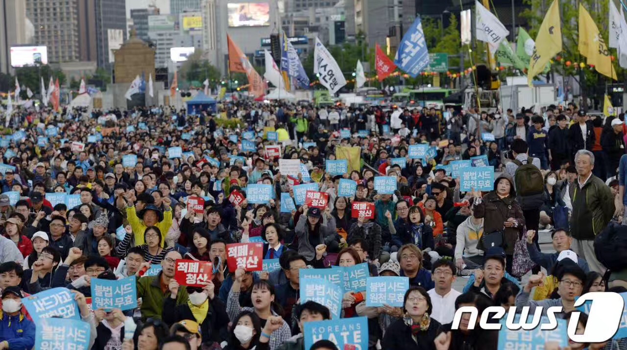 海外网4月29日电据韩国纽西斯通讯社报道,当地时间29日下午,由1500多个韩国市民团体联合组织的“朴槿惠政权下台非常国民行动”,在首尔光华门广场举行第23次“泛国民行动日”示威活动。示威民众高呼口号,要求政府撤回萨德,废除朴槿惠政府时期推出的“成果年俸制”等,以清除社会积弊。
