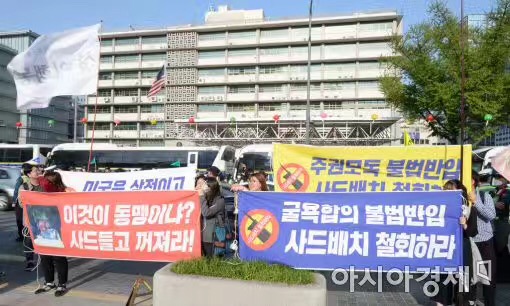 示威民众打出“屈辱协商,非法部署,抓紧撤走萨德”“美国还是盟友吗?带上萨德快滚吧!”等口号