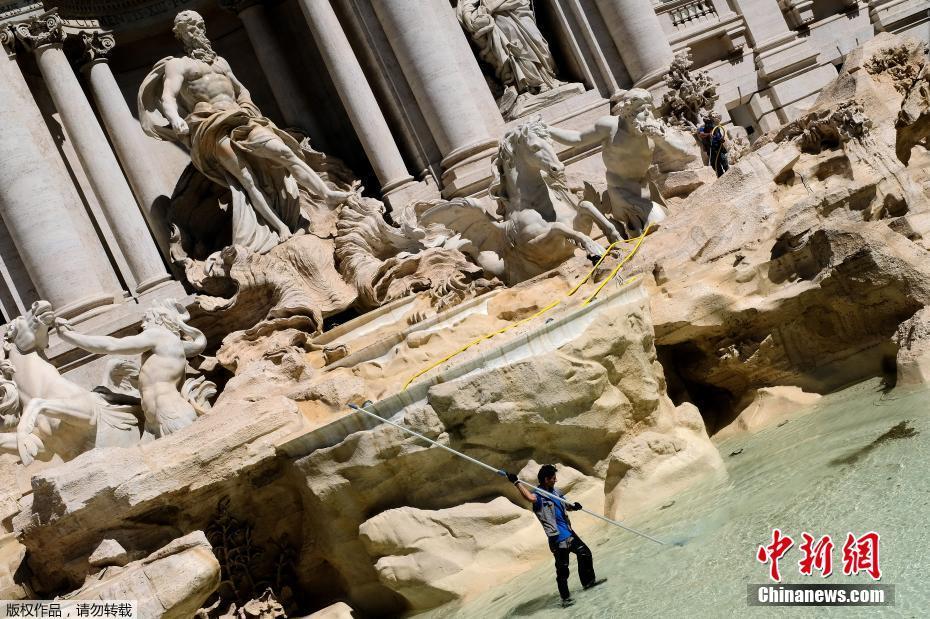 当地时间2017年5月2日,意大利罗马,一名工人在特莱维喷泉里收集硬币。每年从喷泉里收集到的硬币大约价值100万欧元。