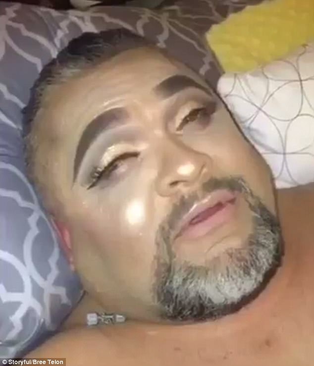 布里将自己给父亲化妆的图片和小视频上传到了“推特”上面。视频开始时,布里已经给父亲化好了眉毛,正准备化烟熏眼妆。她用手稳住父亲的头,先用化妆刷给父亲化上金闪闪的眼影,接下来涂上高光,然后又化上眼线,抹上口红,甚至还安上了假睫毛。最后,她用透明睫毛膏整理了父亲的胡须。