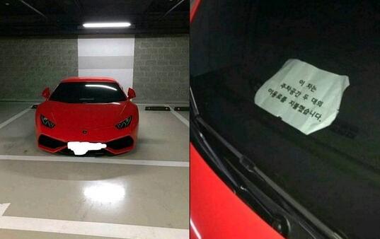这种事件不止一件!另外一位韩国网友也在停车场看见一辆红色兰博基尼,直接停在2个车位的中间,但靠近后仔细一看,车内的纸条上写着“这台车已经缴纳了2个车位的停车费用”。(中国台湾网 韩静)