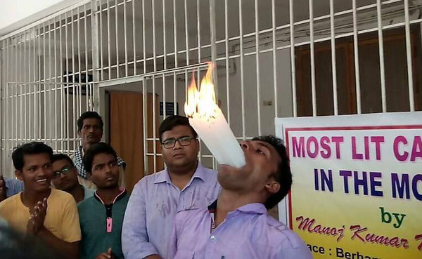 据报道,这名男子是来自印度东部的23岁大学硕士生莫哈拉纳(Manoj Kumar Moharana),近日在地方官员办公室前,他将21根蜡烛逐一点燃,接着将蜡烛一根一根放进嘴中,让围观民众都吓傻了,后来把蜡烛取出后,他便开始将一颗颗葡萄塞入口中,只见他满头大汗,费了许多工夫才塞满90颗葡萄。