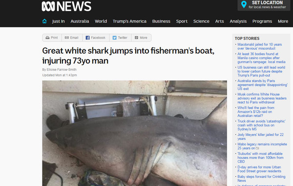 据报道,73岁的特里·塞尔伍德(Terry Selwood)正在海上悠闲钓鱼时,突然有一只大白鲨跃出水面跳入他的船上。塞尔伍德心有余悸的说,他看到一个东西跳入船中,随后他被撞倒在地上。他的手臂被鱼鳍打伤,所幸他并没有被鲨鱼咬到,如果被咬到很可能会大量失血,导致死亡。