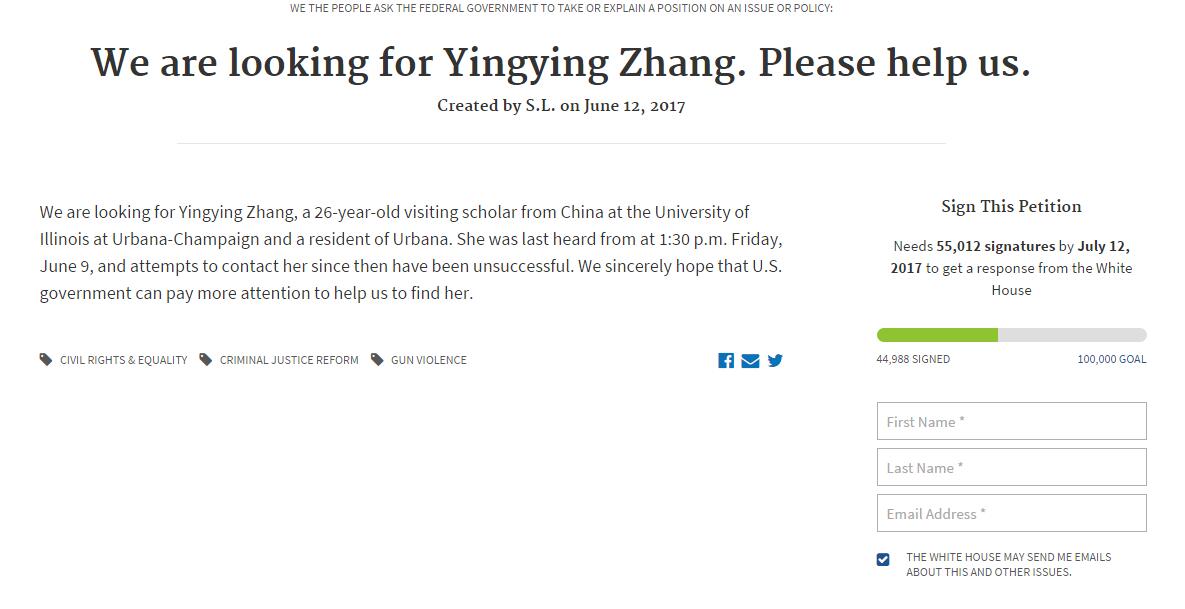 另据海外网早前报道,美国白宫网站上寻找章莹颖的请愿已获超过4万人签名。据“白宫请愿网”显示,截至目前,寻找章莹颖的请愿已经获得44988人签名。