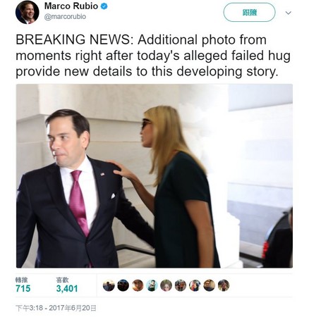 伊万卡身兼“第一女儿”和总统顾问,当天赴国会山庄与卢比奥等议员讨论造福美国家庭的税改政策。卢比奥事后在推特上澄清,一连发出5、6条推文开自己玩笑,说道“我们正在调查这件失败的拥抱,会尽快给予答复”“我们正在找寻多重角度的监视器画面,来研究这件重要的事”,还分享了其它当时的照片。伊凡卡则加入讨论,发文说道“我不予置评,但我肯定会拥抱他的!”化解了尴尬。(中国台湾网 郭晓康)