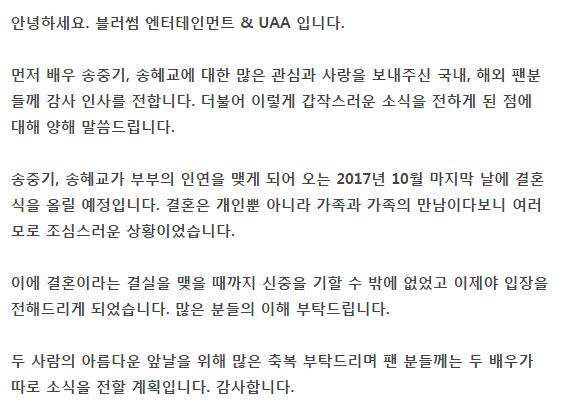 宋仲基所属经纪公司Blossom娱乐与宋慧乔所属经纪公司UAA官方发表联合声明,内容如下: