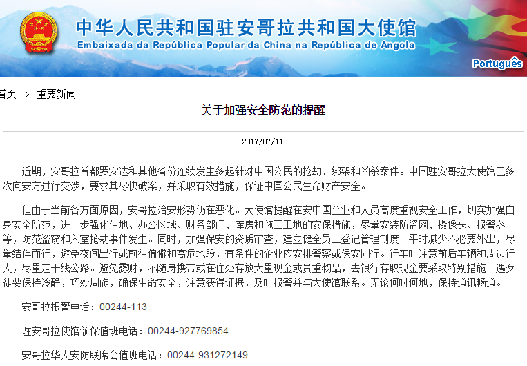 使馆网站称,近期,安哥拉首都罗安达和其他省份连续发生多起针对中国公民的抢劫、绑架和凶杀案件。使馆已多次向安方进行交涉,要求其尽快破案,并采取有效措施,保证中国公民生命财产安全。