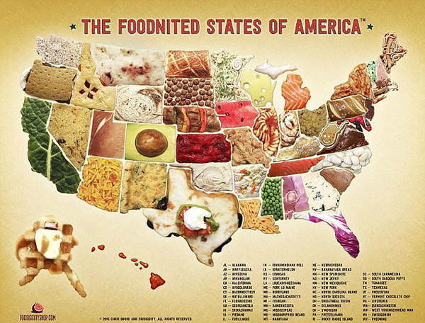 【环球网综合报道】据英国《每日邮报》7月20日报道,美食网站Foodiggity创始人克里斯·杜尔索(Chris Durso)和他的儿子卡梅隆·杜尔索(Cameron Durso)共同用食物为美国50个大州制作了系列美食地图,并采取双关语为之命名,其奇思妙想令人称奇。
