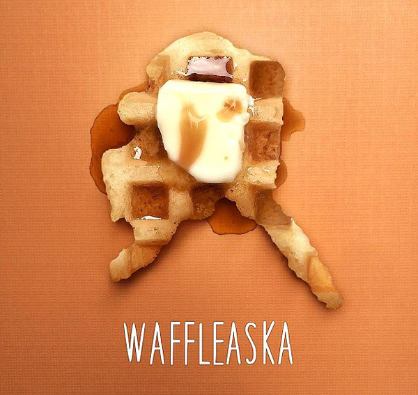 起初,8岁的卡梅隆向父亲提议想要为美国各州制作美食地图。但是克里斯认为这个创意太过时了,于是卡梅隆又想到可以根据不同的食材为各州重新命名,于是父子俩便携手为看客们诚意献上“美味的美利坚合众国”这一大作。他们选用羽衣甘蓝(Kale)创作加利福尼亚州地图,于是“California”(加州)摇身一变成为了“Kalefornia”。父子俩每一副作品都像这样,既让人垂涎欲滴,又充满智慧与灵感。
