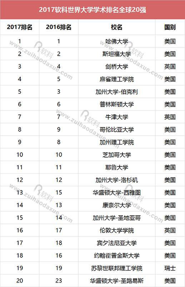 先看位于塔尖的超一流高校。自2003年世界大学学术排名首次发布以来,哈佛大学已连续第15年蝉联全球第一,斯坦福大学位列世界第二。剑桥大学两年内连升两名,位列全球第三。麻省理工学院从第5名升至第4名。十强中的另一座英国高校——牛津大学位列第七。耶鲁大学则排在十强之外。欧洲大陆大学中排名最高的是瑞士苏黎世联邦理工学院,排在全球第19名。