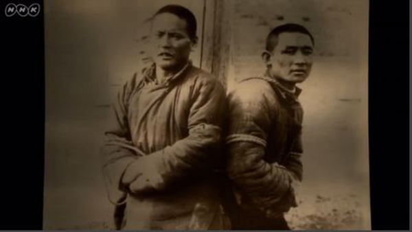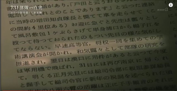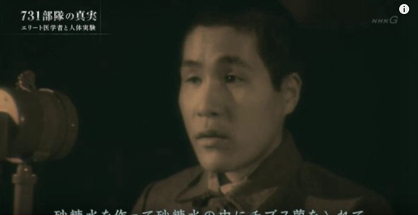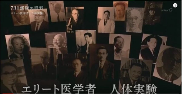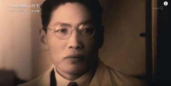 解说员:“731部队”实施实验的(地点),是位于中国东北部旧满洲的秘密研究所。活生生地被当成试验材料而死去的人,据说达到了3000人以上。为何人体试验会被推进到如此规模?NHK电视台从国内外收集到了数百件资料。浮出水面的,不仅是日本军人,还有从东京大学、京都大学等调集而来的“精英医学者”,(他们)也主导着人体试验这一实际事态。