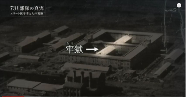 解说员:这是(“731部队”总部)当时的照片。部队在方圆数公里的广阔营地中,极其秘密地实施着研究。在四方形的三层大楼里,并排着的是装备有制冷制暖设备的最先进的研究室。大楼中央设置有从周围无法看见的牢狱,用来关押被用作试验材料的人们。