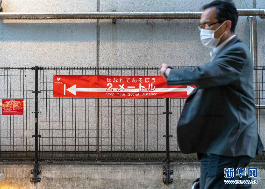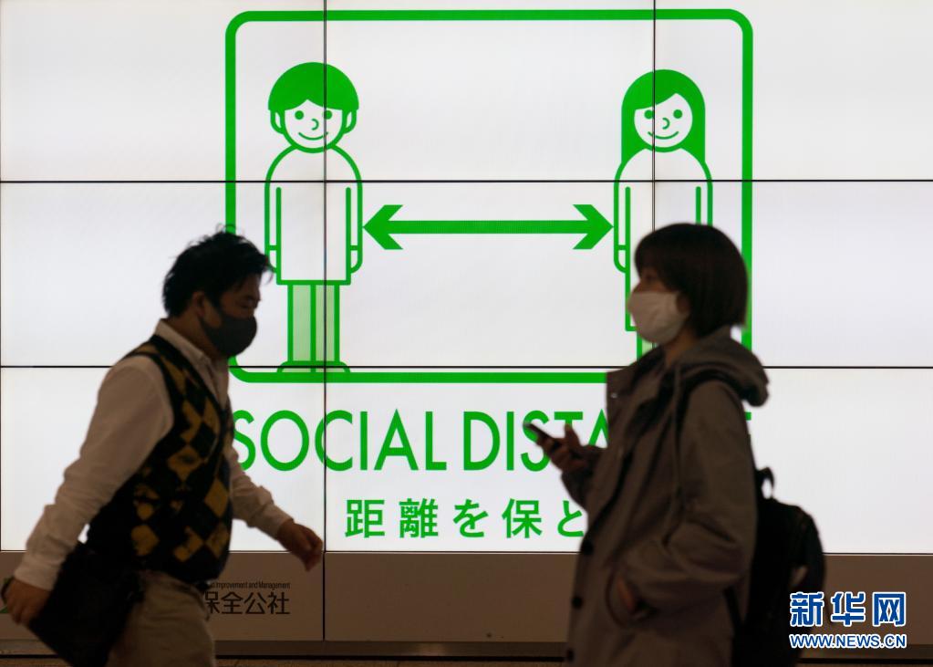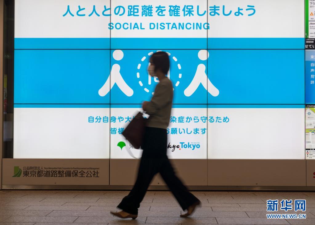 4月23日,日本东京的行人走过街头提醒人们保持社交距离的标识。新华社发(克里斯托弗·朱摄)