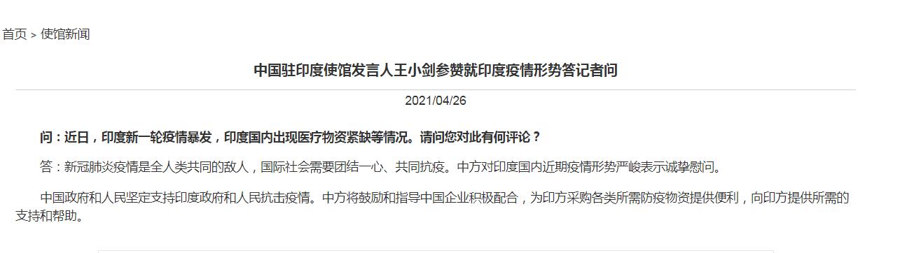 中新网4月26日电 据中国驻印度使馆网站消息,中国驻印度使馆发言人王小剑26日表示,中国政府和人民坚定支持印度政府和人民抗击疫情。中方将鼓励和指导中国企业积极配合,为印方采购各类所需防疫物资提供便利,向印方提供所需的支持和帮助