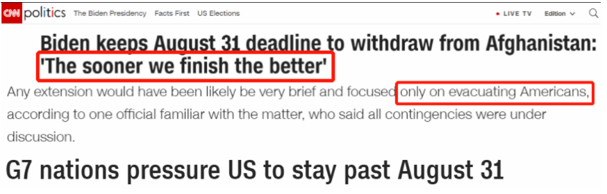 “按计划”的潜台词就是8月31日前美军将撤离阿富汗。而此前,七国集团(G7)领导人阿富汗问题特别会议上,以英国首相约翰逊为首的G7领导人敦促拜登延长最后期限,因为需要更多时间来疏散他们的公民。