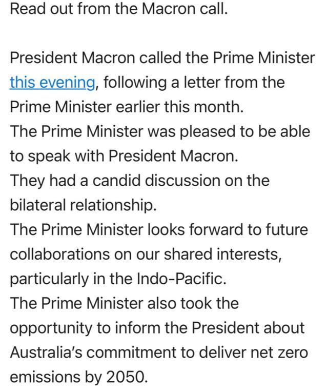 其中,澳大利亚政府发布的关于两国领导人通话的声明十分简短,大意是澳方称莫里森总理和马克龙总统就双边关系进行了“坦率”的交流,莫里森“期待”与法方在印度太平洋地区等双方有着共同利益的事务上继续合作。