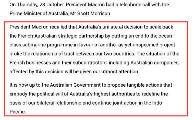 如下图所示,在法国总统府发布的双方通话声明中,法方一上来就再次吐槽了澳大利亚之前在潜艇问题上背叛法国的举动,称这一行为损害了双方的互信和双方企业的利益,并称澳方应该为重新建立起两国在印太地区的合作和双边关系而拿出诚意。