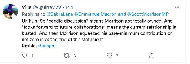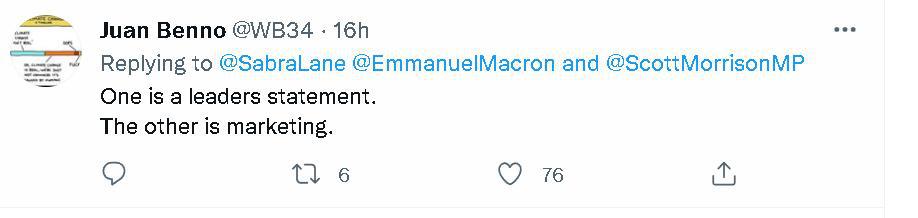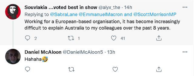 总之,当法方这份马克龙在通话中对莫里森一阵数落和讽刺的声明发布后,不少澳大利亚网民都觉得很尴尬。一些本身就很反感莫里森的网民还讽刺起了莫里森,称他为了自己的政治利益歪曲通话内容,并认为法国对澳大利亚的抨击很有道理。