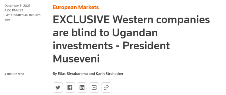 【环球网报道】路透社5日发布了一篇对乌干达总统穆塞韦尼的独家采访报道。穆塞韦尼在采访时对比了中西方企业对该国的投资,称西方企业已经不再有看到机会的眼睛,而中国人看到了机会,并且来得非常积极。
