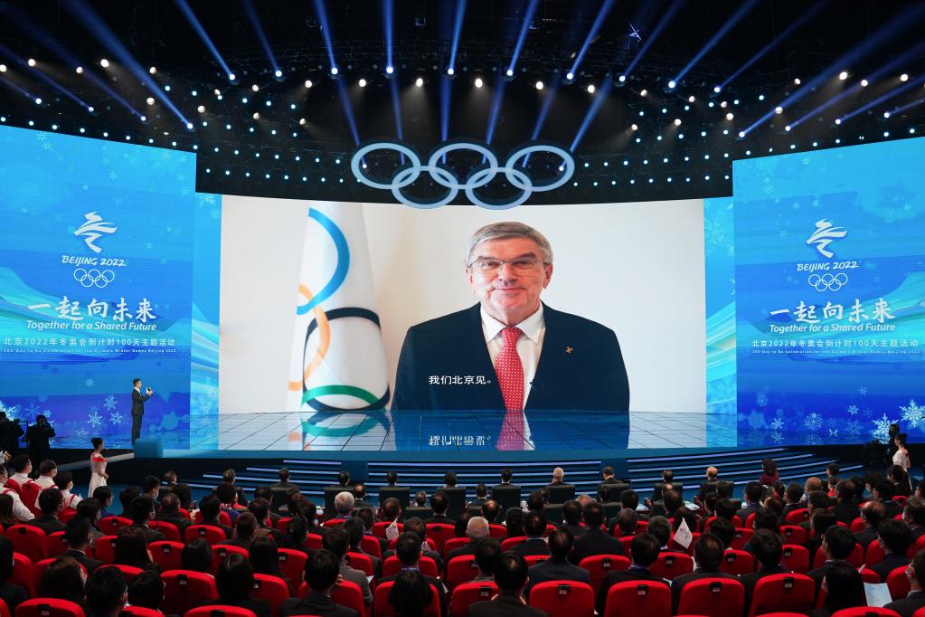 2021年10月25日,北京2022年冬奥会倒计时100天主题活动在北京举行,国际奥委会主席托马斯·巴赫通过视频连线致辞。新华社记者 鞠焕宗 摄