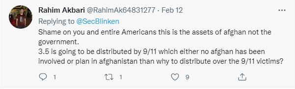 网友Rahim Akbari在美国国务卿布林肯推特账号下评论,“为你(布林肯)和所有美国人民感到羞耻,这是阿富汗人的资产,不是政府的。阿富汗人没有参与‘911',为什么要把他们的35亿资产分配给‘911'的受害者”?