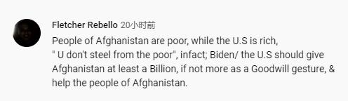 网友Flecher Rebello称,“阿富汗人民贫穷,而美国富有。你们不要偷穷人的了。实际上,拜登或者美国应该给阿富汗最少10亿(美元),帮帮阿富汗人”。