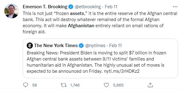 网友Emerson T. Brooking指出,这不仅仅是“冻结资产”,它是阿富汗中央银行的全部储备。这一决定将使阿富汗完全依赖于少量的外国援助。