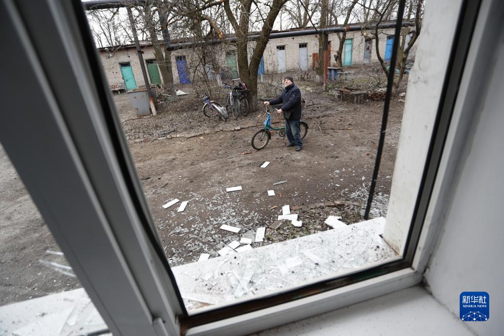 2月24日,顿涅茨克当地居民查看受损的房屋。新华社发