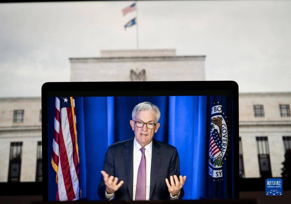3月16日拍摄的视频画面显示,美联储临时主席鲍威尔在华盛顿出席线上新闻发布会。新华社记者 刘杰 摄