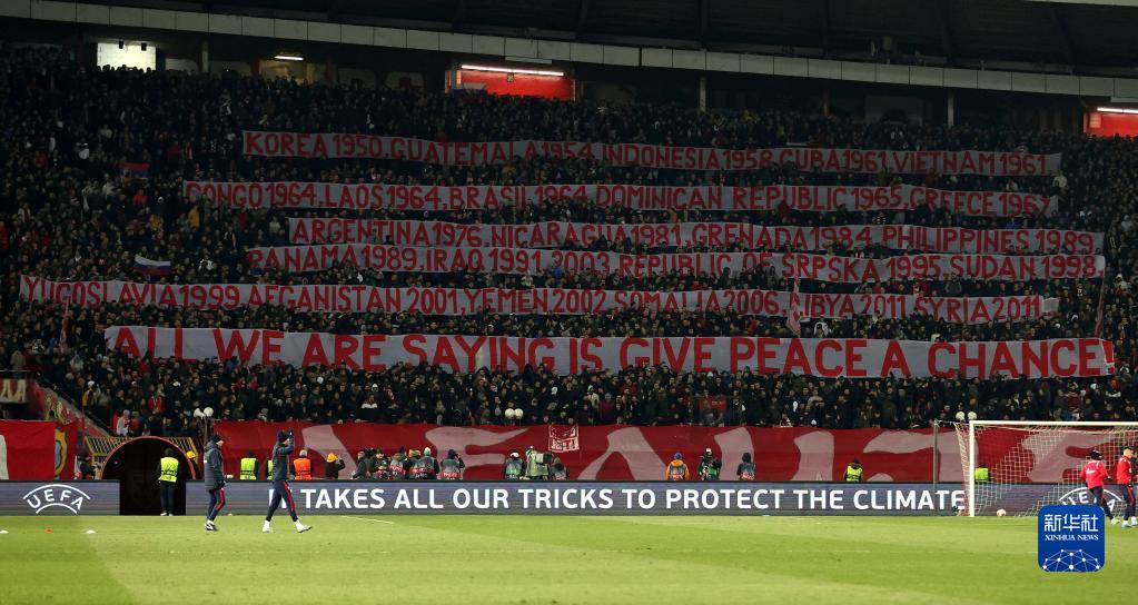 在17日举行的2021-2022赛季欧罗巴联赛八分之一决赛次回合比赛、贝尔格莱德红星队对战苏格兰格拉斯哥流浪者队的比赛中,塞尔维亚观众拉起6条大型横幅。首行横幅引用英国已故知名音乐人约翰·列侬创作的反战歌曲《给和平一个机会》中一句歌词:“我们想说的是,给和平一个机会。”