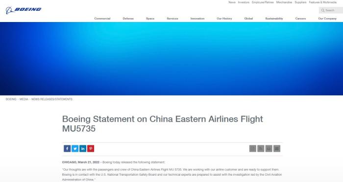 声明全文如下:“我们挂念着东航MU5735航班的每一位乘客和机组成员。我们正与东航开展合作,以向他们提供支持。同时,波音正与美国国家运输安全委员会保持联系,我们的技术专家也为协助中国民航局开展调查做好了准备。 ”
