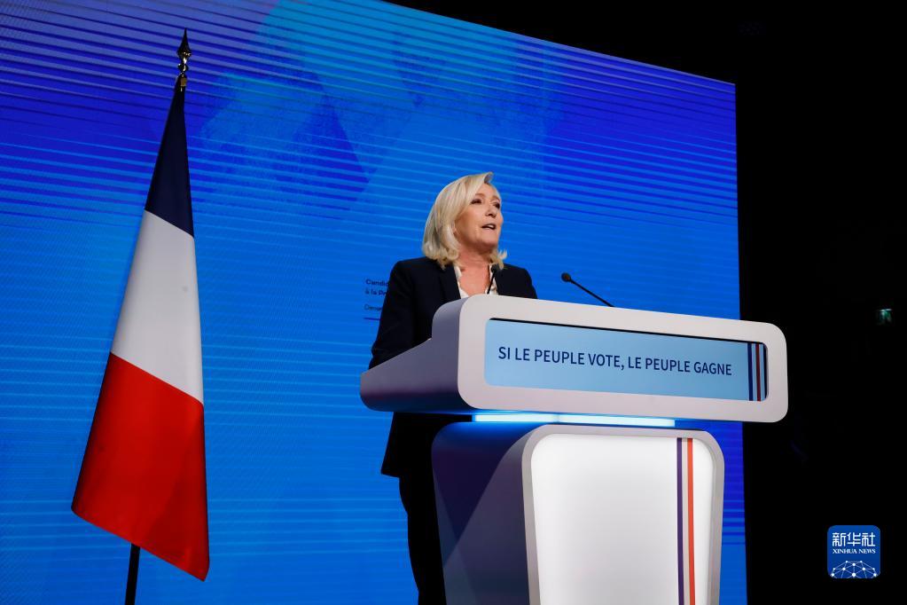 4月10日,法国极右翼政党“国民联盟”候选人玛丽娜·勒庞在巴黎参加总统选举首轮投票后的集会。新华社发(里特·艾斯摄)