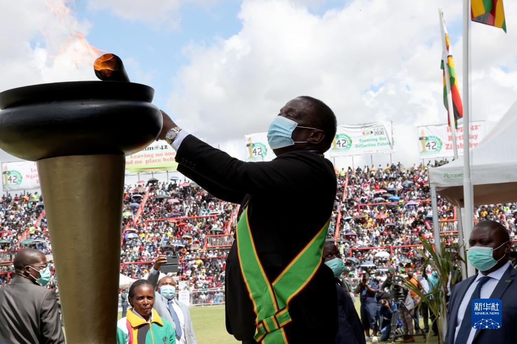 4月18日,在津巴布韦第二大城市布拉瓦约,津总统姆南加古瓦(中)在独立42周年庆典上点燃象征独立的火炬台。新华社发(万达摄)