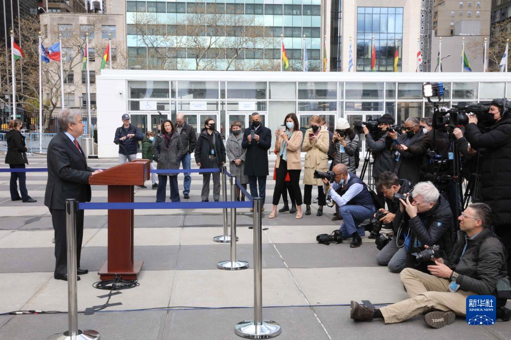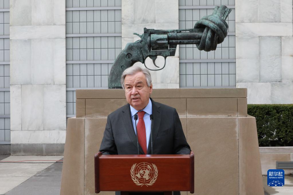 4月19日,联合国秘书长古特雷斯在纽约联合国总部标志性雕塑“打结的手枪”前对记者发表谈话。新华社记者 谢锷 摄