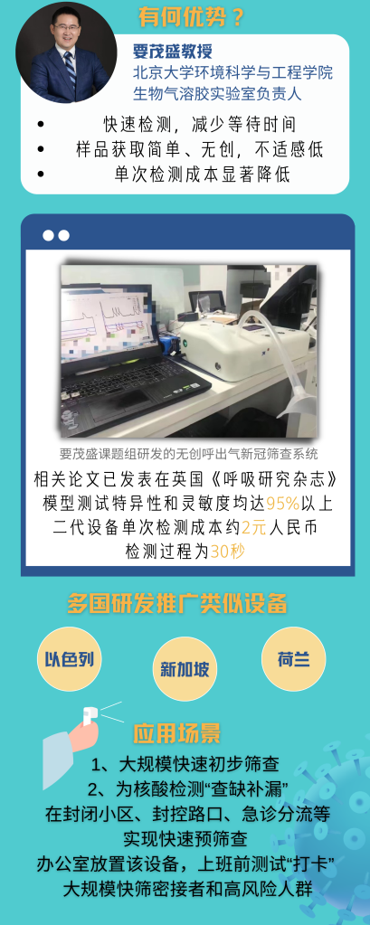 北京大学环境科学与工程学院生物气溶胶实验室负责人要茂盛教授说,与现有的PCR核酸、抗原检测相比,新冠呼气检测可快速检测到早期感染、无症状感染等,减少等待时间;样品的获取简单、无创,大幅降低之前采集鼻咽拭子的不适感;单次检测成本也显著降低。