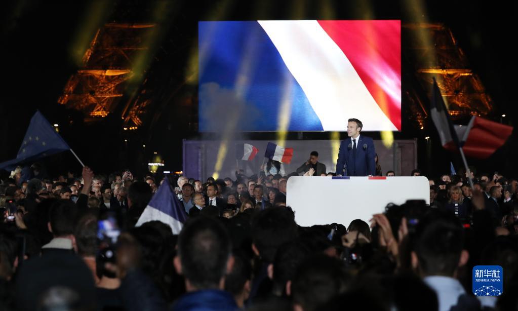 4月24日,法国现任总统马克龙在巴黎出席选举后的庆祝集会。新华社记者 高静 摄