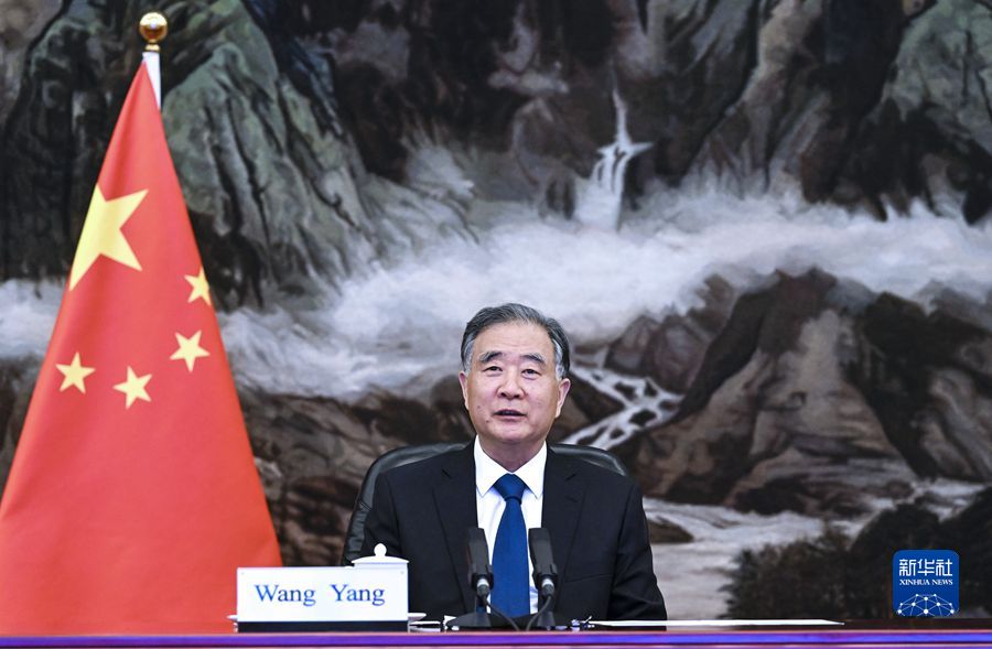5月31日,全国政协主席汪洋在北京以视频方式会见阿尔及利亚民族院议长古吉勒。新华社记者 饶爱民 摄